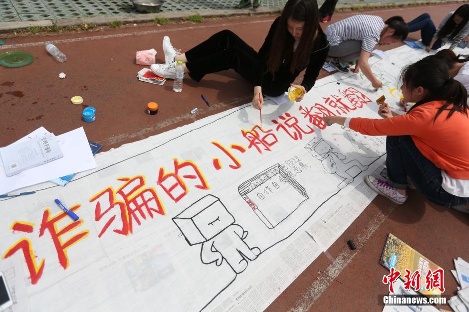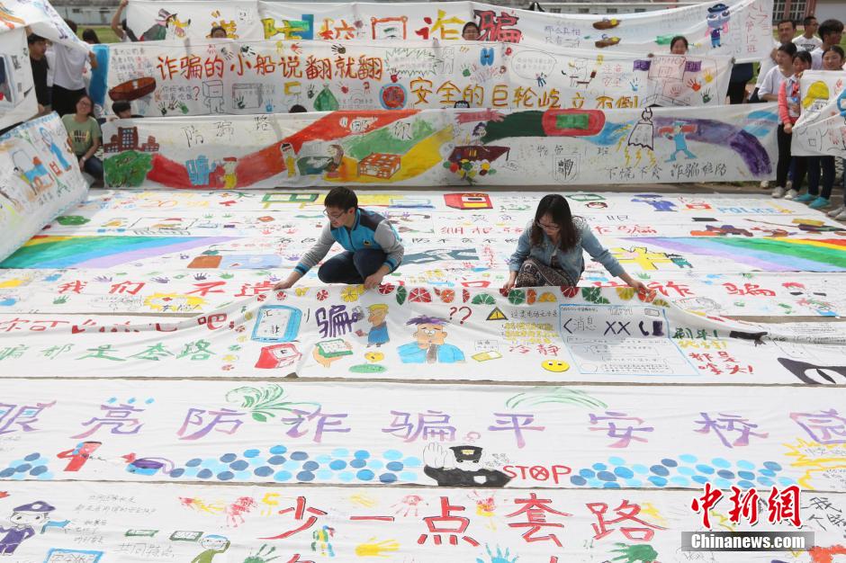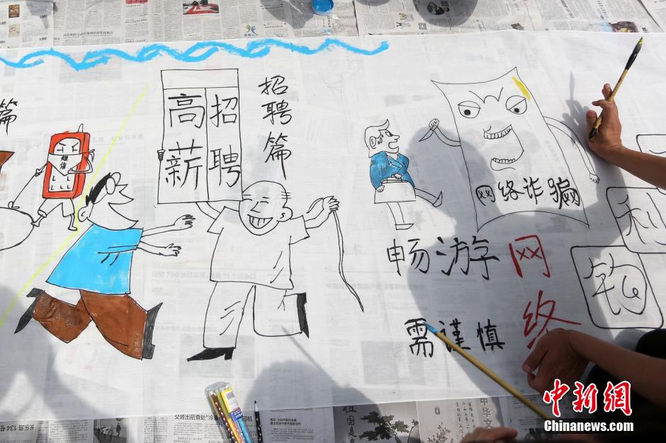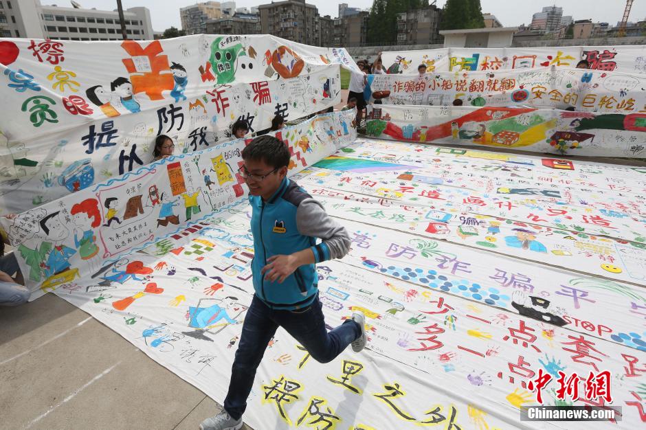 4月22日,以“防詐騙”為主題的手繪公開課在南京郵電大學三牌樓校區(qū)操場上舉行,來自管理學院的600名大一學生一起拿起畫筆,在畫布上繪制“詐騙的小船說來就來”、“親,你可長點心吧!”、“千里之外不見面,提防網絡把你騙”、“招聘廣告莫輕信,天上不會掉餡餅”等朗朗上口、過目不易忘的語句,同時配上五彩顏色的漫畫,用寓教于樂的方式增強大學生們的安全意識。中新社記者 泱波 攝