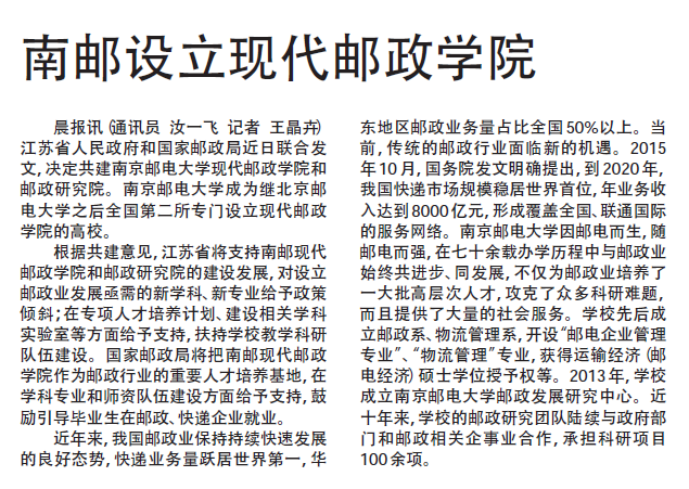 【南京晨報(bào)】南郵設(shè)立現(xiàn)代郵政學(xué)院