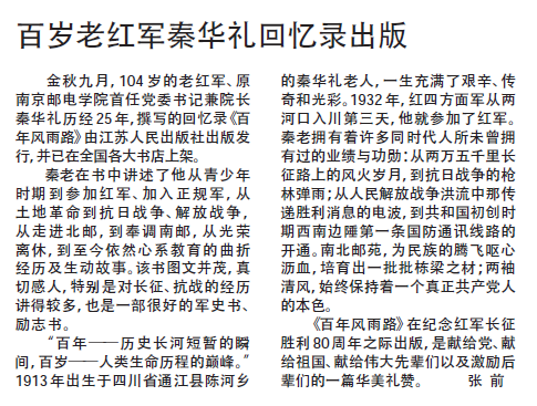 【新華日報】百歲老紅軍秦華禮回憶錄出版