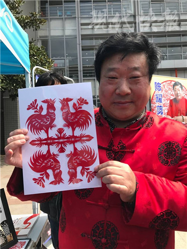 短短數秒 工藝美術大師陳耀就剪出了雞生肖,寓意大吉大利 非遺傳承人走進校園 教大學生做手工 剪紙藝術家陳耀,很多南京人都對他十分熟悉。他每年創意的生肖剪紙都見諸報端,送給人們新年好兆頭。手握一把剪刀,在紅紙上來回“飛舞”,短短數秒,一幅惟妙惟肖的剪紙畫就展現在眼前。陳耀告訴大學生,他從小就喜歡剪紙。“從五六歲開始,到現在已經將近50年了。你們別怕動手難,其實剪紙中有很多樂趣。” 陳耀拿今年的雞生肖舉例,“我的創意都在腦子里,一幅雞有時候光想怎么剪,要半個月時間。思路清晰了,真正在手頭剪起來很快。”他邊剪邊說,剪紙有著非常深厚的文化底蘊,“比如雞生肖,寓意大吉大利、吉祥如意、雞鳴富貴等等,還有老母雞和小母雞在一起的,寓意全家福……” 他說今年是南郵舉辦非遺文化進校園的第三年,他也就來了三年。“我給大學生上課,我希望大家都有耐心靜下來學習這門手藝。我自己當年就是一把剪刀闖天下,現在在南京不僅買房買車,還培養女兒讀了大學。我們的大學生不一定要以剪紙為生,但可以作為樂趣,逢年過節時,親朋好友遇到喜慶日子時,一把剪刀一張紅紙剪一個吉祥喜字、福字貼一貼,都是美好生活的點綴。”