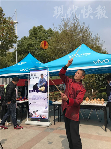 市級非遺傳承人孫桂喜現場展示抖空竹 在陳耀剪紙展位的隔壁,市級非遺傳承人孫桂喜正在教學生們如何抖空竹。嗡嗡地聲響吸引很多學生前來觀賞。孫桂喜說,他已經抖了53年空竹了。“我今年61歲了,從8歲開始,就學這門祖上傳下來的手藝。”他拿著一個空竹告訴現代快報記者,自己這么多年,最擅長做空竹。“做一個空竹,有78道工序,需要用到毛竹、木板、糖樹等材料。從采購竹子,到把竹子劈成一段段,然后浸泡,再上車床加工……”