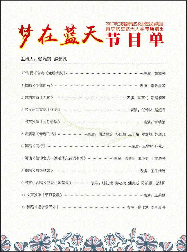 | 關于舉辦2017年江蘇省高雅藝術進校園拓展項目——"夢在藍天"南京航空航天大學專場演的通知 |