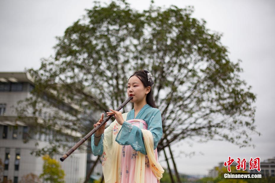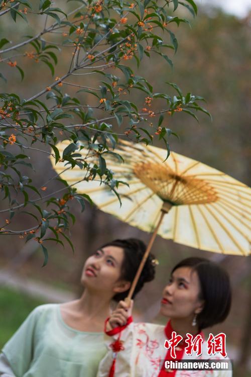 10月11日,南京郵電大學(xué)沅芷古琴社的學(xué)生身著漢服,在120年樹齡的“丹桂王”前賞花吟詩。近日,南京郵電大學(xué)仙林校區(qū)丹桂園中千株丹桂陸續(xù)開放,其淡雅的香氣沁人心脾,引得師生們徜徉期間。據(jù)介紹,園內(nèi)這棵120年樹齡的“丹桂王”名為“大葉朱砂桂”,來自“中國丹桂之鄉(xiāng)”福建省南平市浦城縣,經(jīng)過精心維護,成為了南京高校中的又一景點新名片。中新社記者 泱波 攝