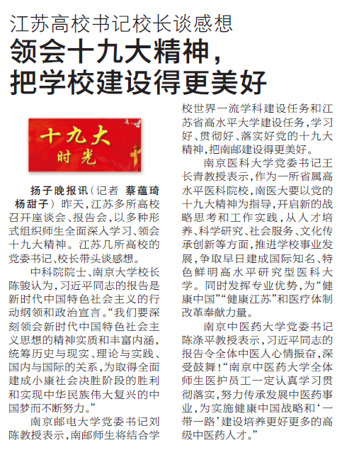【揚子晚報】領會十九大精神, 把學校建設得更美好