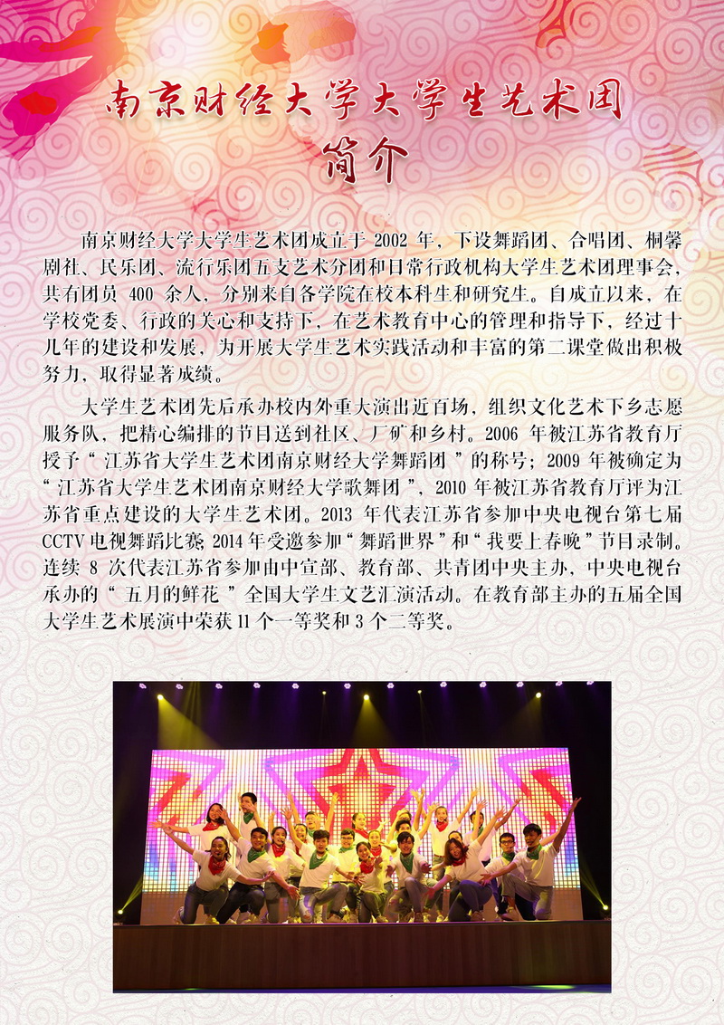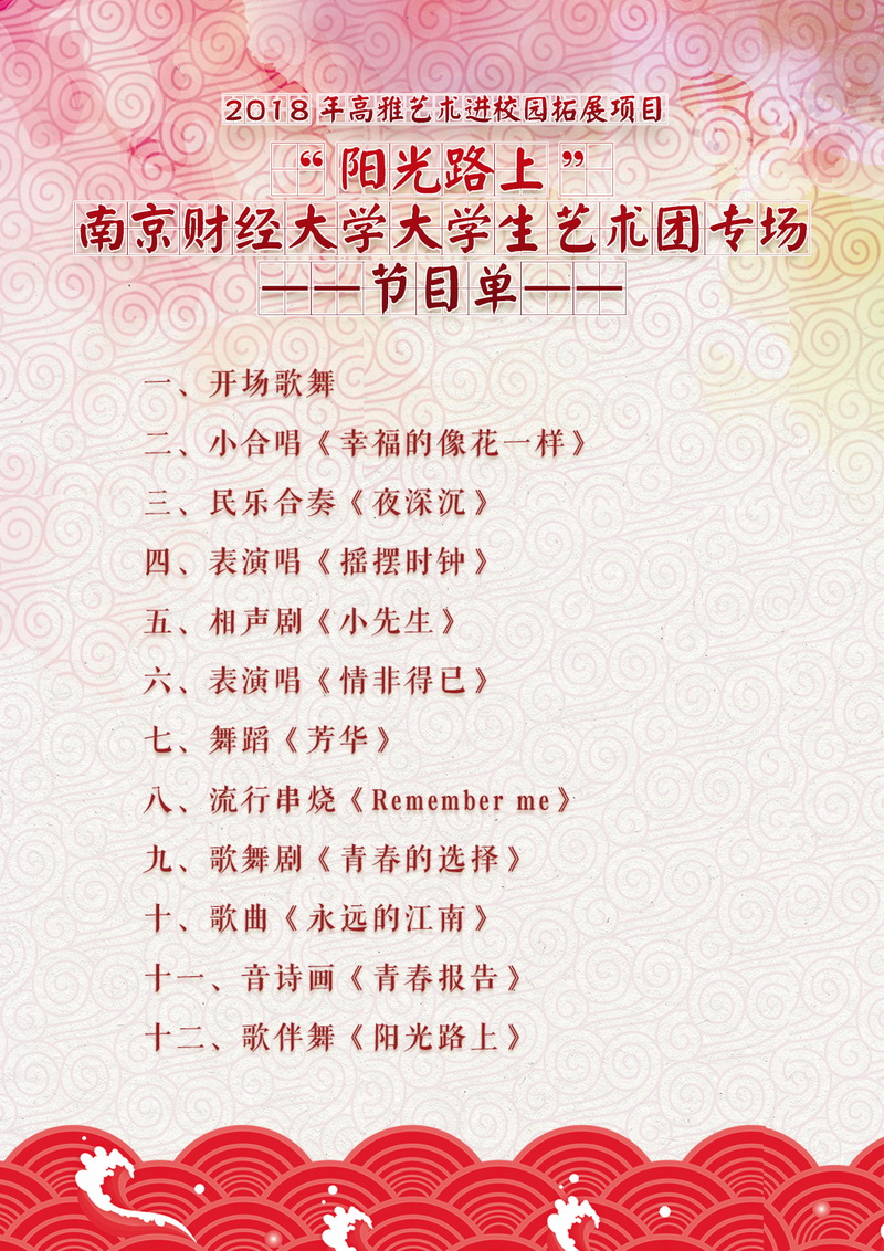 | 關于舉辦2018年江蘇省高雅藝術進校園拓展項目——“陽光路上”南京財經大學大學生藝術團專場演出的通知 |