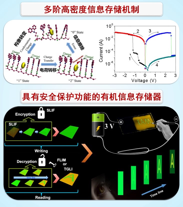 同時,團隊還致力于推動金屬有機半導體的多功能化,發展智能響應型金屬有機半導體,并實現了高密度和高安全性信息存儲。項目第二完成人、南京郵電大學趙強教授介紹,現在大家使用的U盤,是無機半導體材料做的,存儲量和安全性都有待提高。項目組在十多年的研究中,發現有機半導體會在外界物理刺激下產生電學或光學信號的“智能響應”行為,比如給它加個電場后,其分子材料的電學性質和光學性質會發生顯著變化。這種特性可以用于高密度和高安全性的信息存儲。項目組根據這種“智能響應性”,提出了可印刷加工的二階和三階金屬聚合物信息存儲半導體的設計新策略,制備了高穩定電存儲器,率先研制了基于單一聚合物的三階信息存儲器,為發展可印刷加工的超高密度信息存儲提供了有效途徑。在研究中,還發現電場誘導金屬有機半導體磷光變色現象,提出智能響應型有機信息存儲的設計原理,同時利用磷光壽命長的特點,通過時間分辨光學成像,發展了具有安全保護功能的信息存儲技術,開辟了有機信息存儲領域的研究新方向。