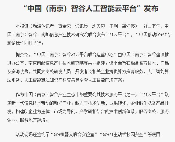 【南京日報】“中國(南京)智谷人工智能云平臺”發布