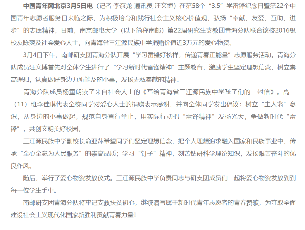 【中國青年網】南郵研支團在三江源學習雷鋒傳遞青春正能量