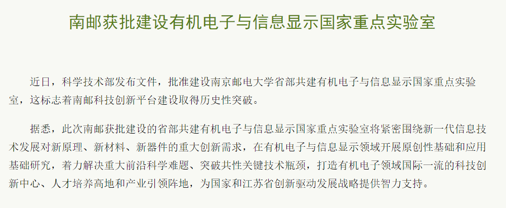 【中國科學(xué)網(wǎng)】南郵獲批建設(shè)有機電子與信息顯示國家重點實驗室