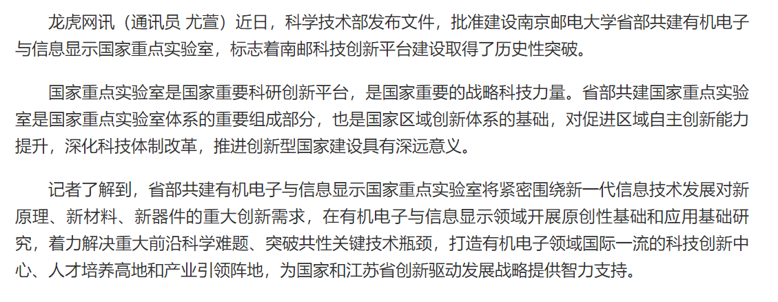 【龍虎網】官宣!南郵省部共建有機電子與信息顯示國家重點實驗室獲批