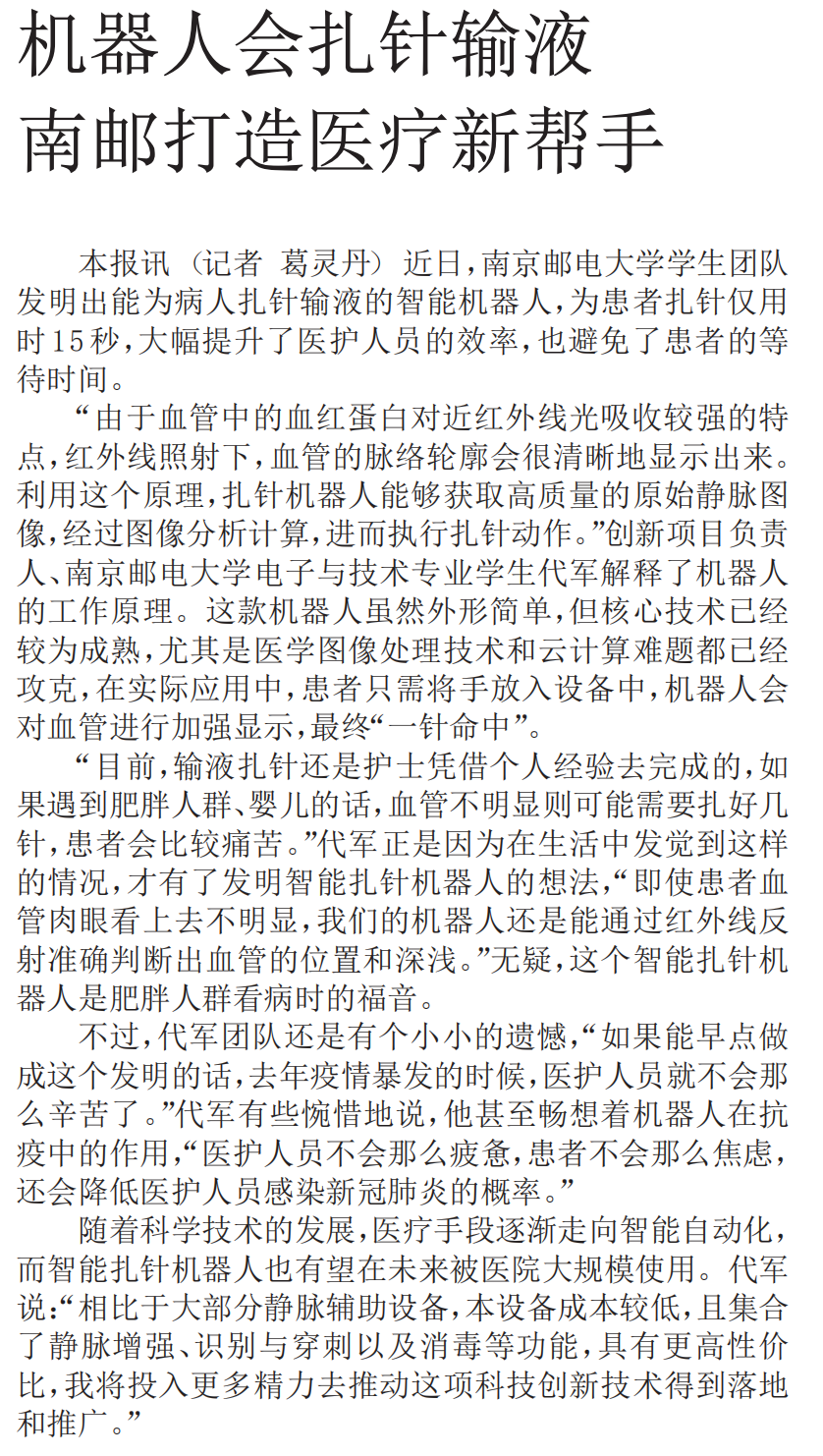 《新華日?qǐng)?bào)》機(jī)器人會(huì)扎針輸液 南郵打造醫(yī)療新幫手