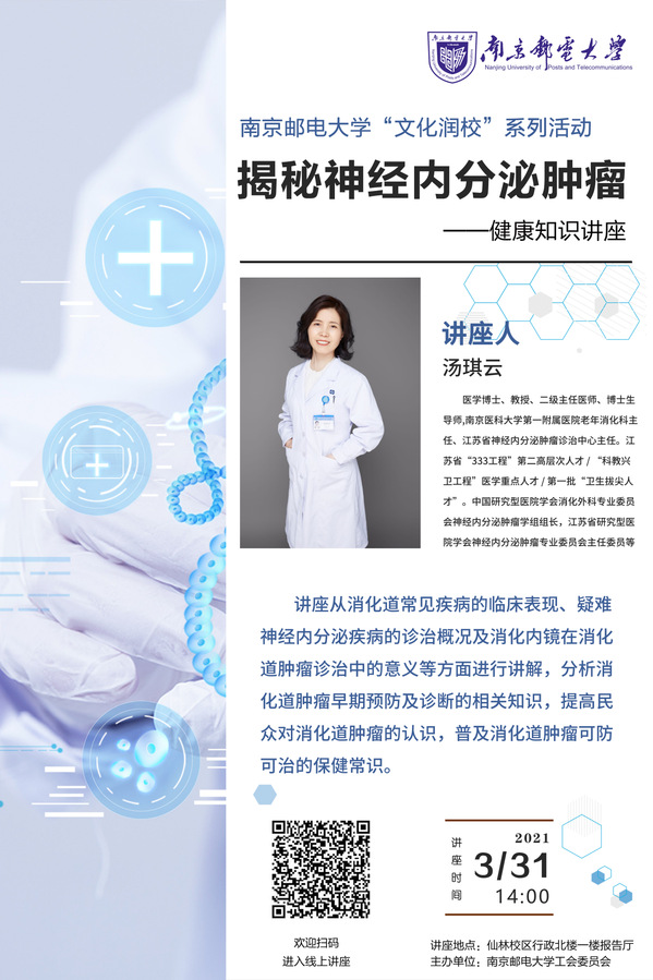 校工會(huì)將于2021年3月31日14:00,在仙林校區(qū)行政樓一樓報(bào)告廳、舉辦“文化潤(rùn)校”系列活動(dòng)之“揭秘神經(jīng)內(nèi)分泌腫瘤——健康知識(shí)講座”。