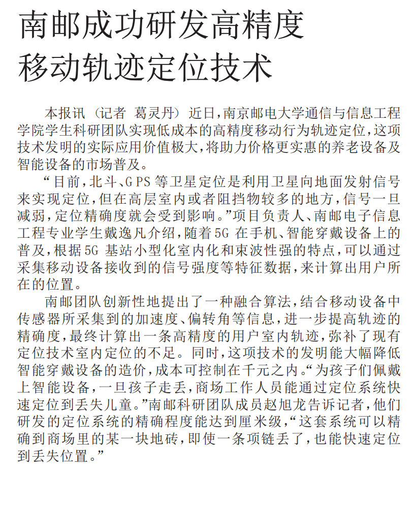 【新華日報】南郵成功研發(fā)高精度移動軌跡定位技術(shù)