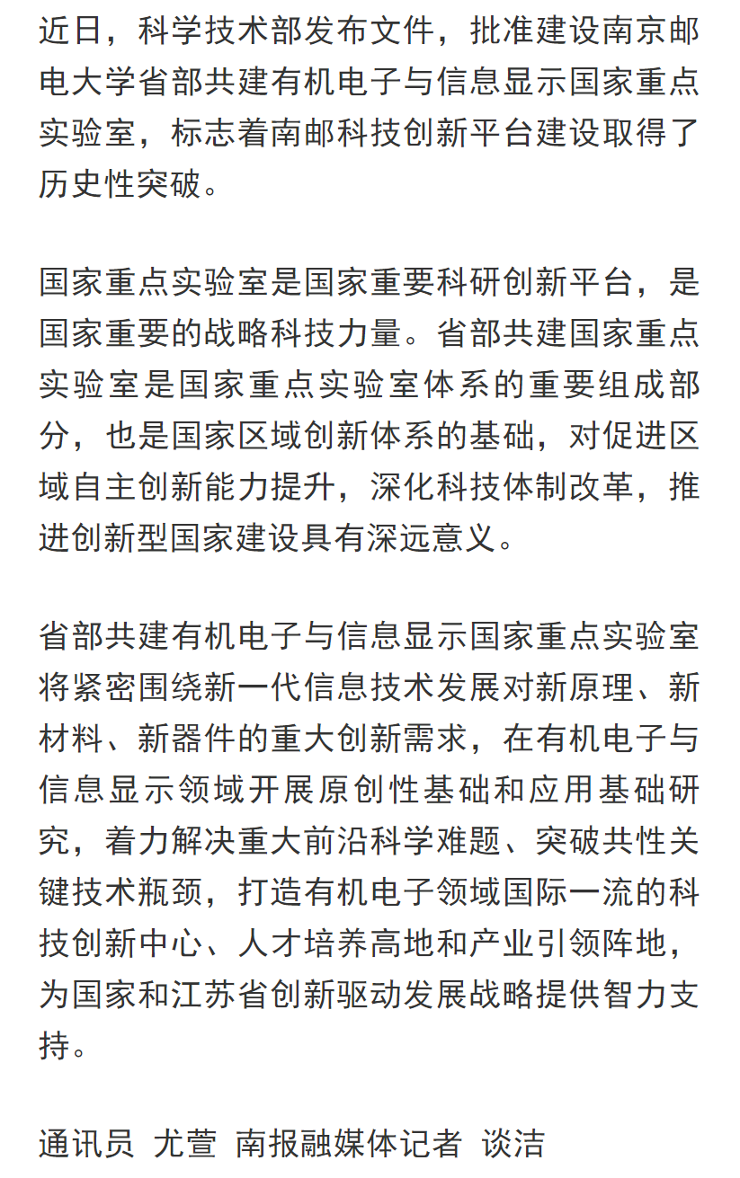 【南京日報(bào)客戶端】研究有機(jī)電子與信息顯示,南郵省部共建國家重點(diǎn)實(shí)驗(yàn)室獲批
