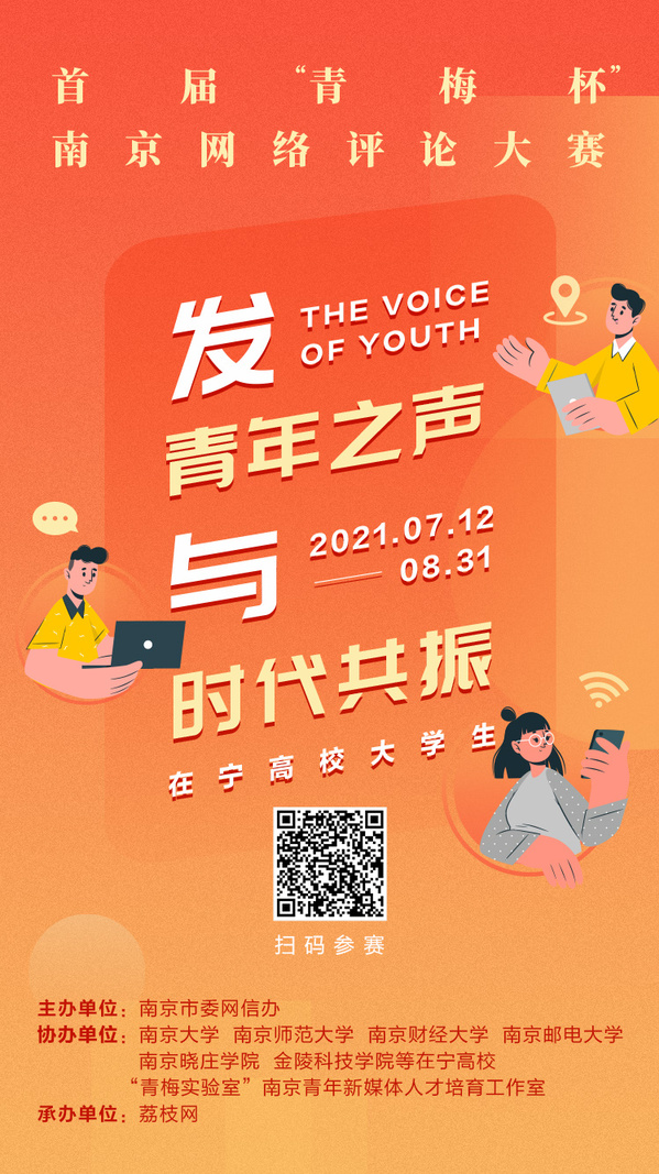 青年強則國強。為充實南京市網(wǎng)絡(luò)評論隊伍,培育南京青年新媒體人才,在建黨100周年這個意義非凡的特殊年份,通過網(wǎng)絡(luò)評論大賽更好引導(dǎo)青年學(xué)子關(guān)注家事、國事、天下事,增進愛黨愛國情懷、提高獨立思考能力,鞏固壯大網(wǎng)絡(luò)主流思想輿論,弘揚主旋律、傳播正能量。 一、大賽主題 發(fā)青年之聲 與時代共振 二、活動組織 主辦單位:南京市委網(wǎng)信辦 協(xié)辦單位:南京大學(xué)、南京師范大學(xué)、南京財經(jīng)大學(xué)、南京郵電大學(xué)、南京曉莊學(xué)院、金陵科技學(xué)院等南京屬地高校,“青梅實驗室”南京青年新媒體人才培育工作室 承辦單位:荔枝網(wǎng) 三、參賽主體 南京屬地高校大學(xué)生 四、評論主題 1、正面理論評論:緊扣“中國共產(chǎn)黨成立100周年”重要時間節(jié)點,圍繞鄉(xiāng)村振興、生態(tài)環(huán)保、科技創(chuàng)新、政務(wù)服務(wù)、民生保障等主題,反映中國共產(chǎn)黨領(lǐng)導(dǎo)下的祖國建設(shè)成就、家鄉(xiāng)發(fā)展變化、人民奮斗風(fēng)貌。 2、熱點時事評論:選取近期或今年以來的熱點事件、社會現(xiàn)象,注重文章獨立思考,言之成理,思辨嚴(yán)謹(jǐn),思想深刻。(范文見附件) 五、參賽要求 1.征集時間:2021年7月12日——2021年8月31日 2.作品要求: ?。?)千字左右評論文章(一般不超過2000字),漫畫、音視頻、H5、沙畫等新媒體產(chǎn)品皆可。 ?。?)題目自擬、觀點鮮明,邏輯清晰,風(fēng)格積極向上。 ?。?)參賽作品必須為原創(chuàng)作品,且此前未公開發(fā)表。杜絕抄襲與一稿多投。 3.投稿方式:發(fā)送至郵箱njwpshc@163.com,聯(lián)系人:蘇芮 18061736190。參賽作品務(wù)必完整,規(guī)范填寫作者信息:學(xué)校+班級+姓名+手機號。 六、作品評選 投稿截止后,經(jīng)過初審和復(fù)評,預(yù)計9月中旬評出一等獎、二等獎、三等獎和優(yōu)秀獎作品,并為獲獎?wù)咛峁┆劷稹s譽證書等獎勵。 獎金設(shè)置:一等獎3000元/名,二等獎2000元/名,三等獎1000元/名。 南京市委網(wǎng)信辦社會工作處 2021年7月5日 |