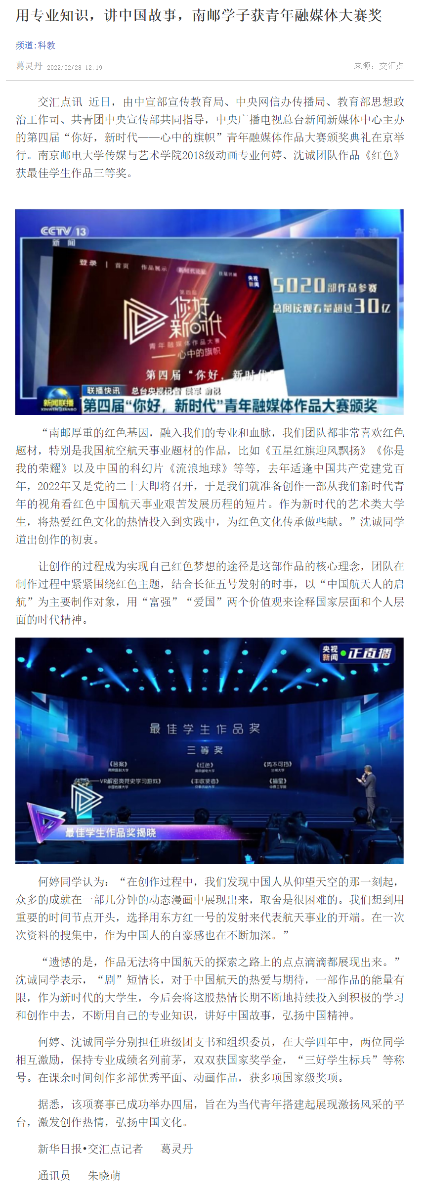| 【新華日報客戶端】用專業(yè)知識,講中國故事,南郵學子獲青年融媒體大賽獎 |