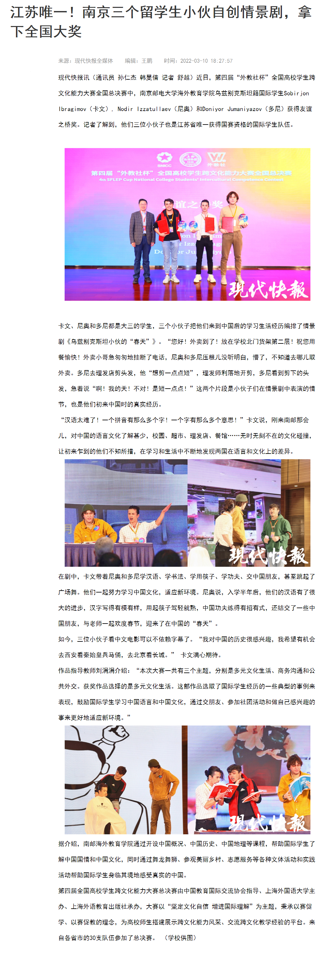| 【現(xiàn)代快報(bào)全媒體】江蘇唯一!南京三個(gè)留學(xué)生小伙自創(chuàng)情景劇,拿下全國(guó)大獎(jiǎng) |