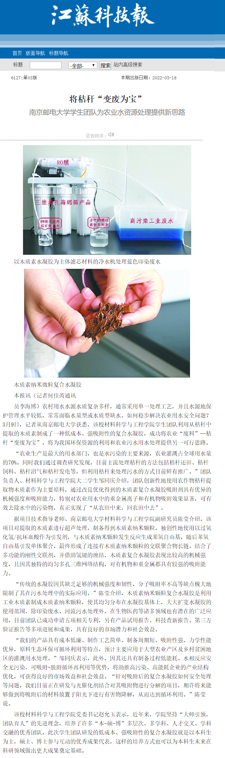 【江蘇科技報(bào)】將秸稈“變廢為寶” 南京郵電大學(xué)學(xué)生團(tuán)隊(duì)為農(nóng)業(yè)水資源處理提供新思路