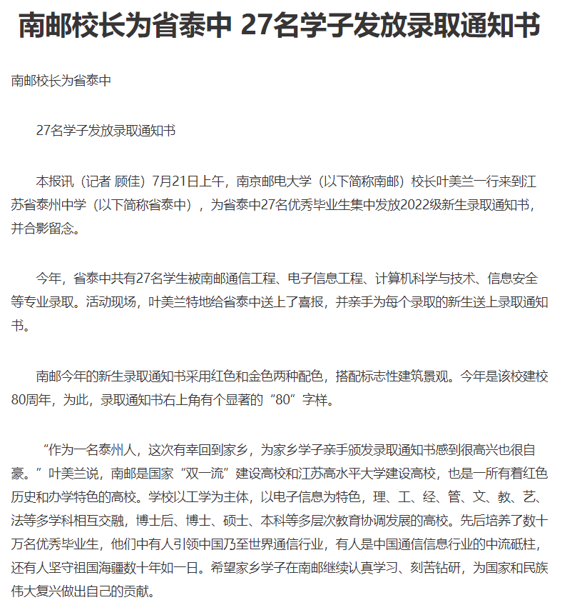 【泰州日報】南郵校長為省泰中 27名學(xué)子發(fā)放錄取通知書