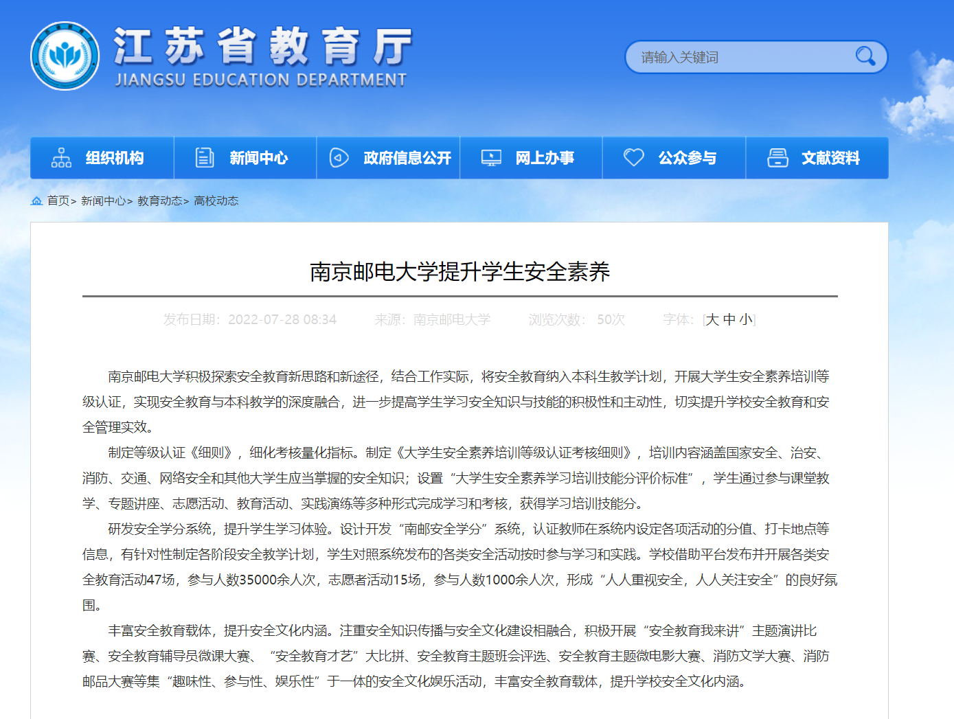 | 【省教育廳官網】南京郵電大學提升學生安全素養 |