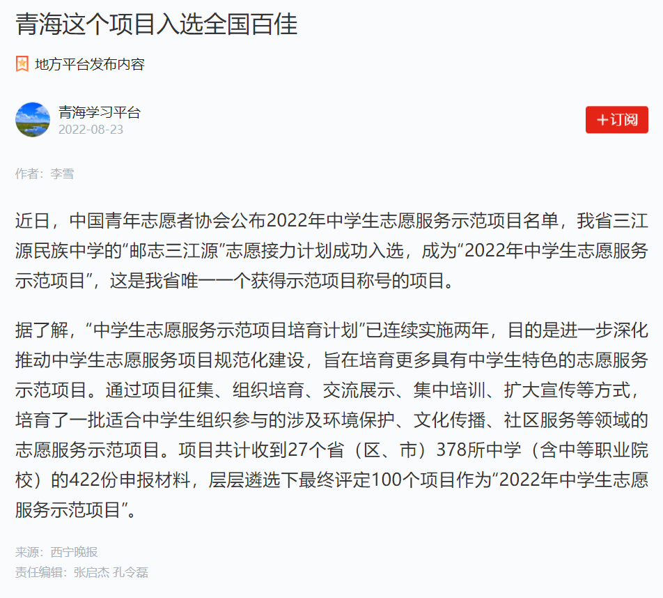 【學習強國】我校研支團指導的“郵志三江源”志愿接力計劃入選“2022年中學生志愿服務示范項目”
