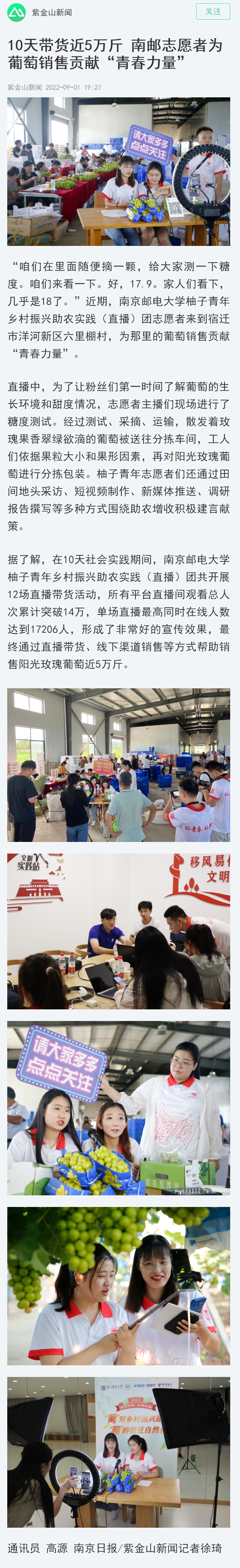 | 【南京日報客戶端】10天帶貨近5萬斤 南郵志愿者為葡萄銷售貢獻“青春力量” |