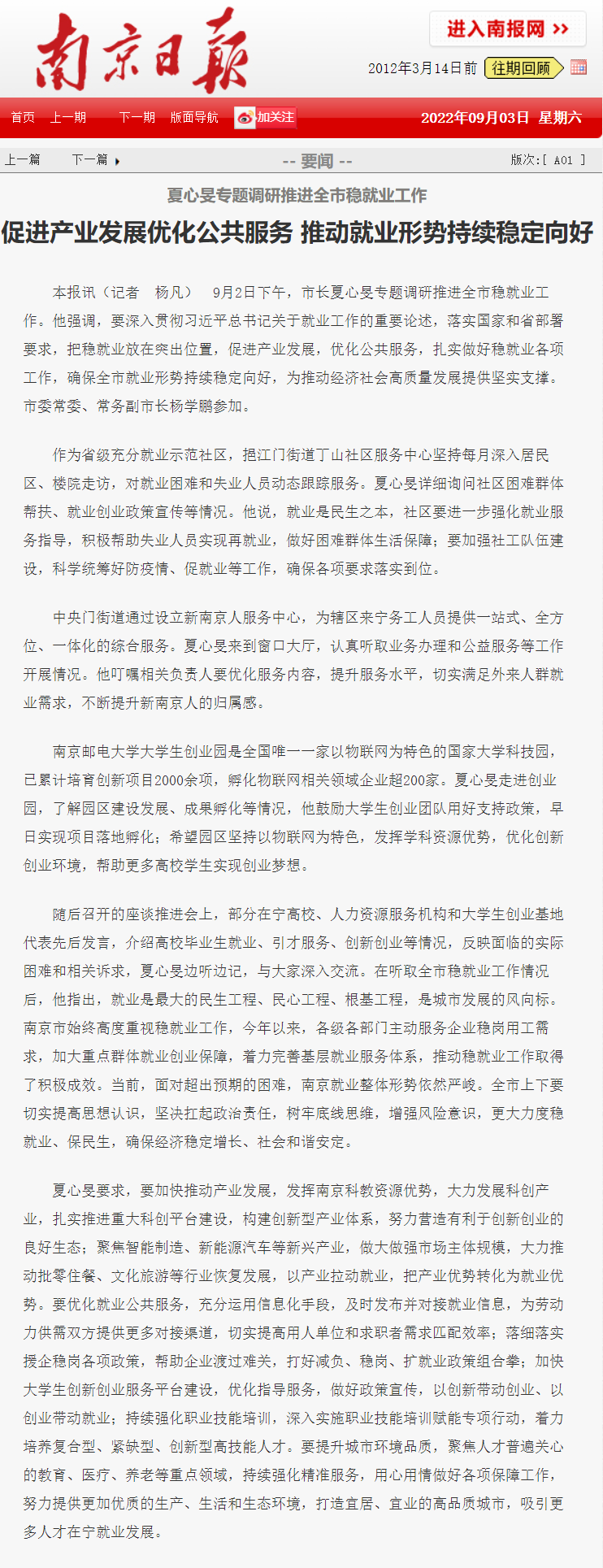 | 【南京日報】頭版:促進產(chǎn)業(yè)發(fā)展優(yōu)化公共服務(wù) 推動就業(yè)形勢持續(xù)穩(wěn)定向好 |