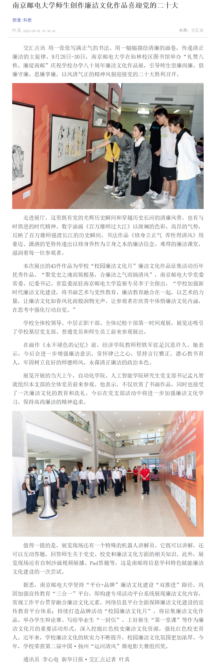 | 【新華日報客戶端】南京郵電大學(xué)師生創(chuàng)作廉潔文化作品喜迎黨的二十大 |