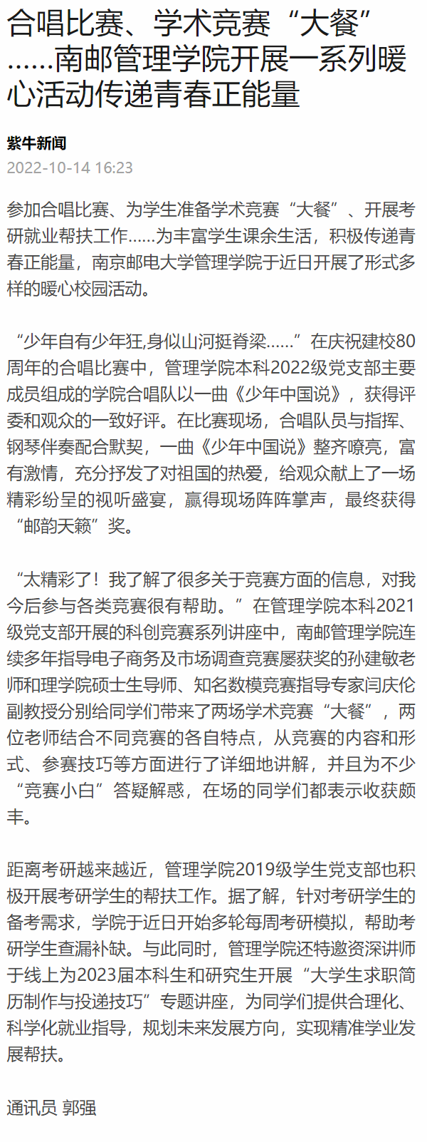 | 【揚子晚報客戶端】合唱比賽、學術競賽“大餐”……南郵管理學院開展一系列暖心活動傳遞青春正能量 |