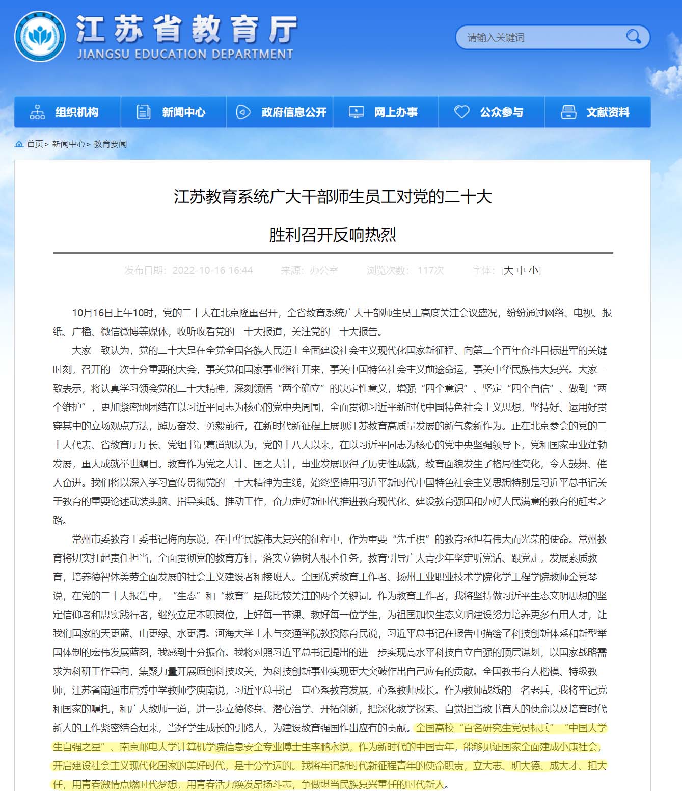 | 【省教育廳官網】江蘇教育系統廣大干部師生員工對黨的二十大 勝利召開反響熱烈 |
