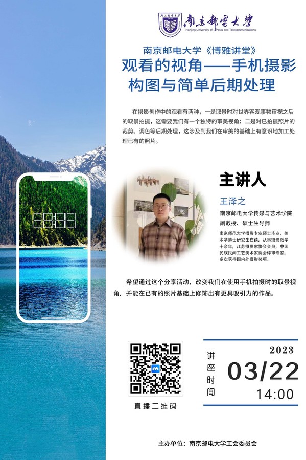 校工會將舉辦《博雅講堂》文化潤校系列活動《觀看的視角——手機攝影構圖與簡單后期處理》講座,歡迎參加學習。 時間:2023年3月22日(本周三)14:00 講座開展方式:騰訊會議平臺 講座二維碼: 南京郵電大學工會委員會 2023年3月20日 |