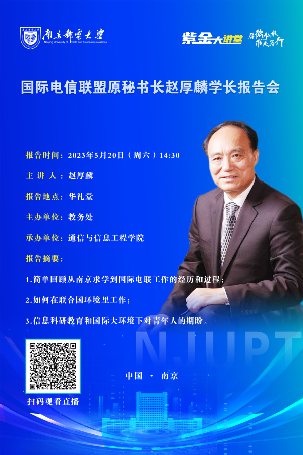 報(bào)告時間:2023年5月20日(周六)14:30 主講人:趙厚麟 報(bào)告地點(diǎn):華禮堂 主辦單位:教務(wù)處 承辦單位:通信與信息工程學(xué)院 報(bào)告摘要: 1. 簡單回顧從南京求學(xué)到國際電聯(lián)工作的經(jīng)歷和過程; 2. 如何在聯(lián)合國環(huán)境里工作; 3. 信息科研教育和國際大環(huán)境下對青年人的期盼。 報(bào)告會同步直播,收看二維碼如下: |