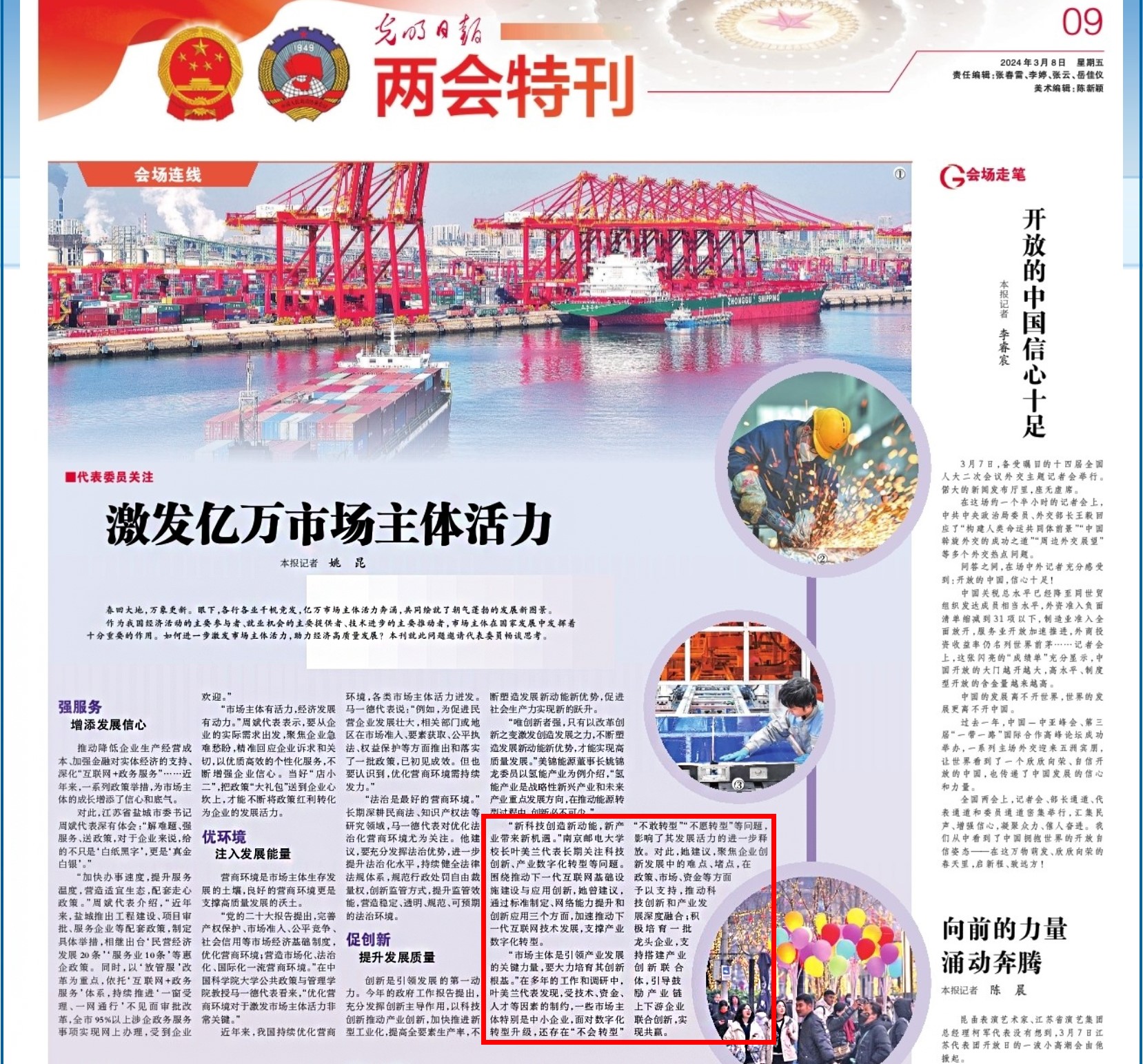“新科技創造新動能,新產業帶來新機遇。”南京郵電大學校長葉美蘭代表長期關注科技創新、產業數字化轉型等問題。圍繞推動下一代互聯網基礎設施建設與應用創新,她曾建議,通過標準制定、網絡能力提升和創新應用三個方面,加速推動下一代互聯網技術發展,支撐產業數字化轉型。 “市場主體是引領產業發展的關鍵力量,要大力培育其創新根基。”在多年的工作和調研中,葉美蘭代表發現,受技術、資金、人才等因素的制約,一些市場主體特別是中小企業,面對數字化轉型升級,還存在“不會轉型”“不敢轉型”“不愿轉型”等問題,影響了其發展活力的進一步釋放。對此,她建議,聚焦企業創新發展中的難點、堵點,在政策、市場、資金等方面予以支持,推動科技創新和產業發展深度融合;積極培育一批龍頭企業,支持搭建產業創新聯合體,引導鼓勵產業鏈上下游企業聯合創新,實現共贏。 文章鏈接:https://epaper.gmw.cn/gmrb/html/2024-03/08/nw.D110000gmrb_20240308_1-09.htm