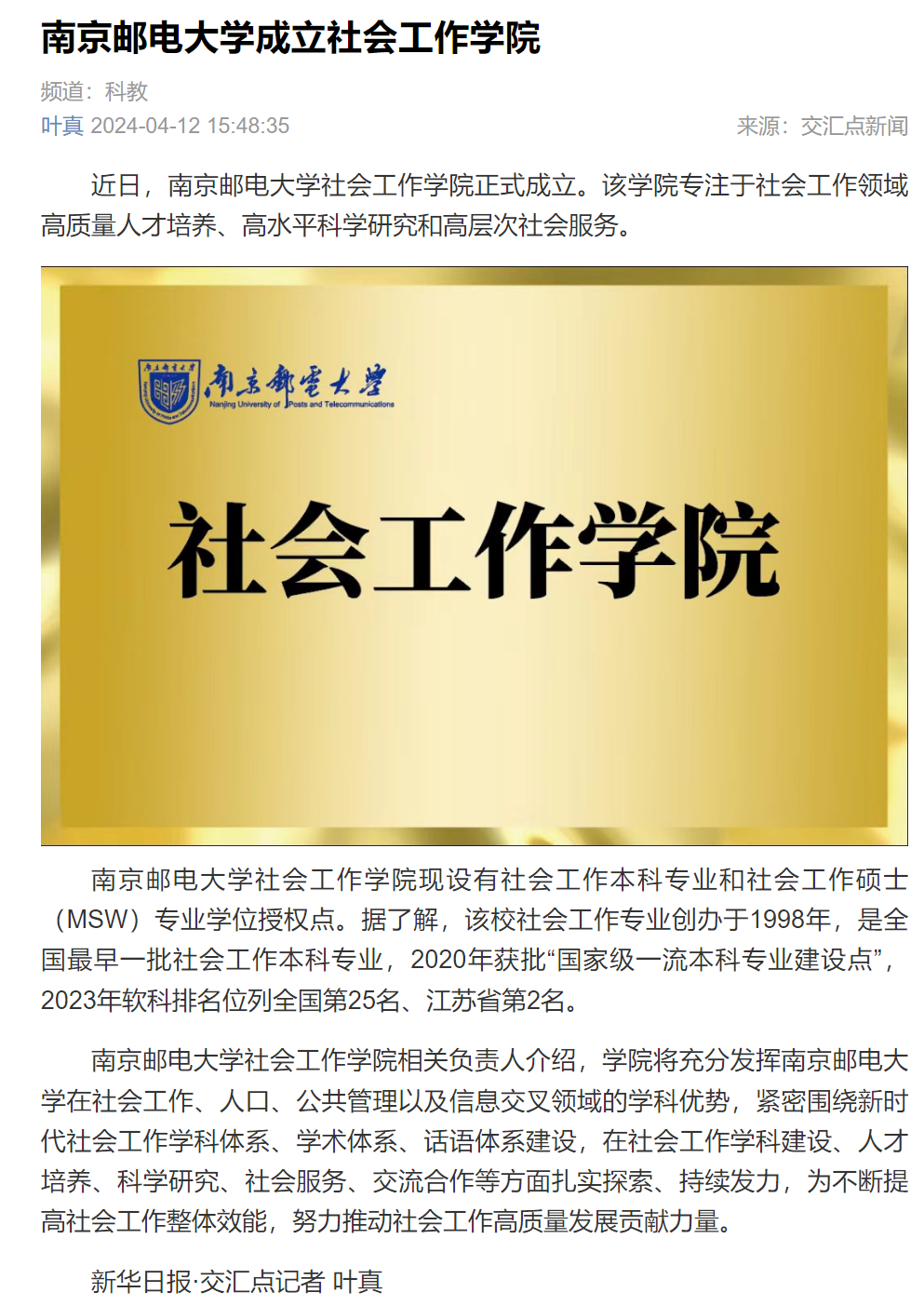 【新華日報客戶端】南京郵電大學成立社會工作學院