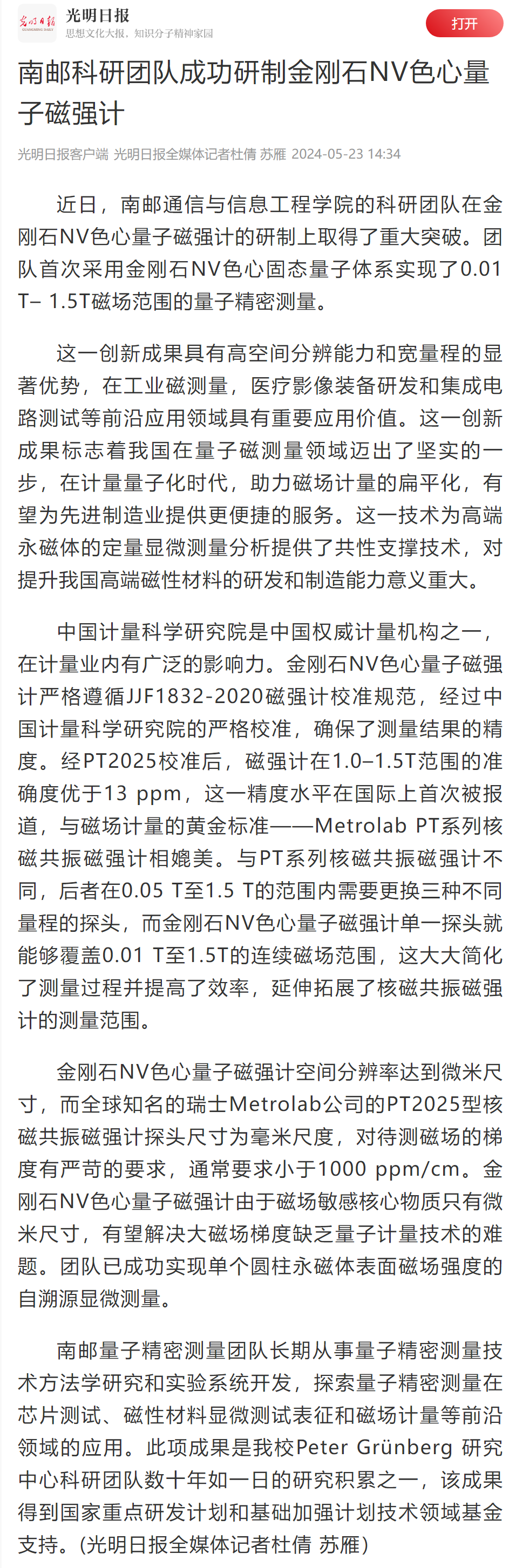 【光明日報客戶端】南郵科研團隊成功研制金剛石NV色心量子磁強計