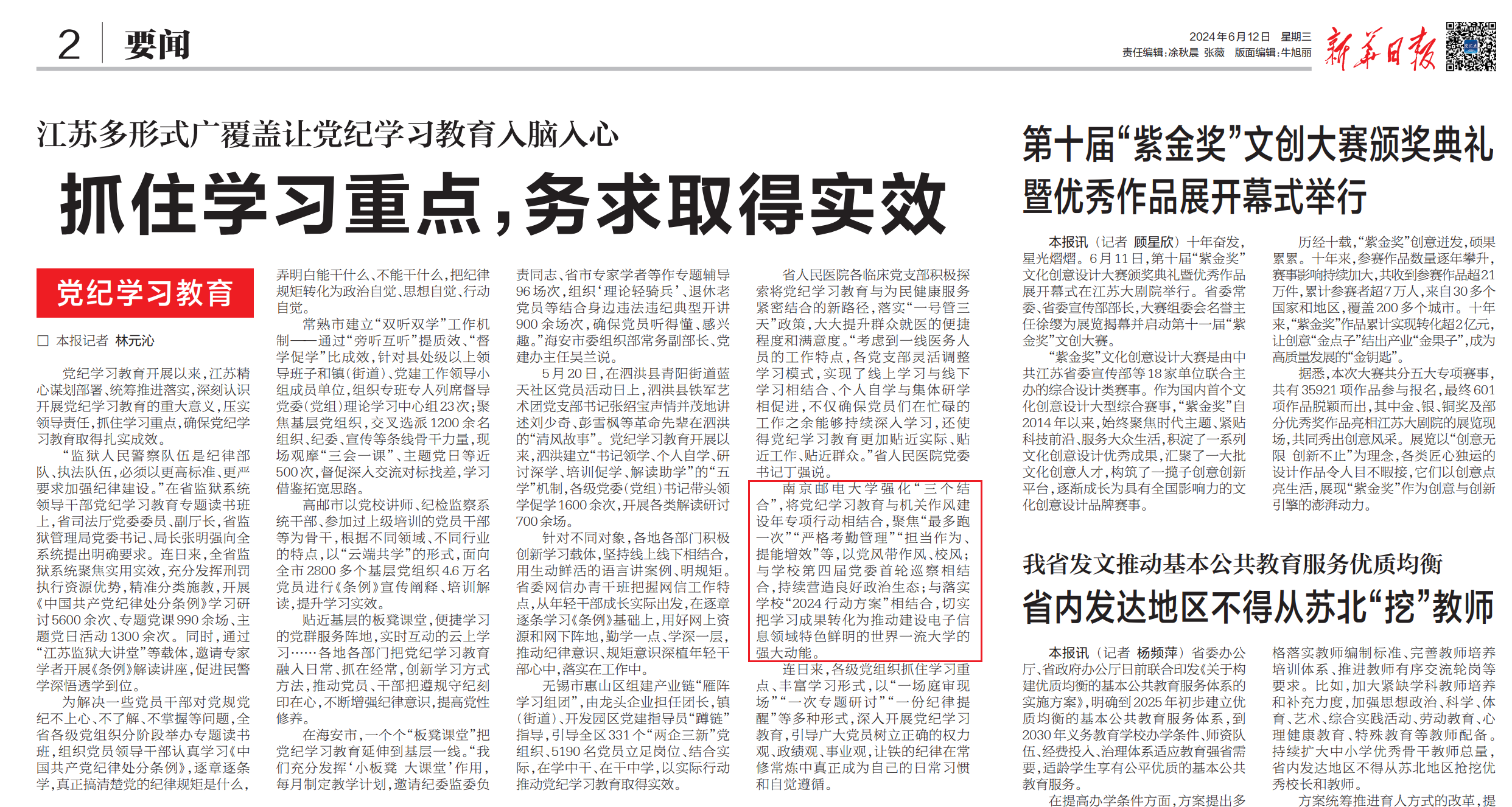 南京郵電大學(xué)強(qiáng)化“三個(gè)結(jié)合”,將黨紀(jì)學(xué)習(xí)教育與機(jī)關(guān)作風(fēng)建設(shè)年專項(xiàng)行動(dòng)相結(jié)合,聚焦“最多跑一次”“嚴(yán)格考勤管理”“擔(dān)當(dāng)作為、提能增效”等,以黨風(fēng)帶作風(fēng)、校風(fēng);與學(xué)校第四屆黨委首輪巡察相結(jié)合,持續(xù)營(yíng)造良好政治生態(tài);與落實(shí)學(xué)校“2024行動(dòng)方案”相結(jié)合,切實(shí)把學(xué)習(xí)成果轉(zhuǎn)化為推動(dòng)建設(shè)電子信息領(lǐng)域特色鮮明的世界一流大學(xué)的強(qiáng)大動(dòng)能。 文章鏈接:https://xh.xhby.net/pc/layout/202406/12/node_2.html#content_1336575 |