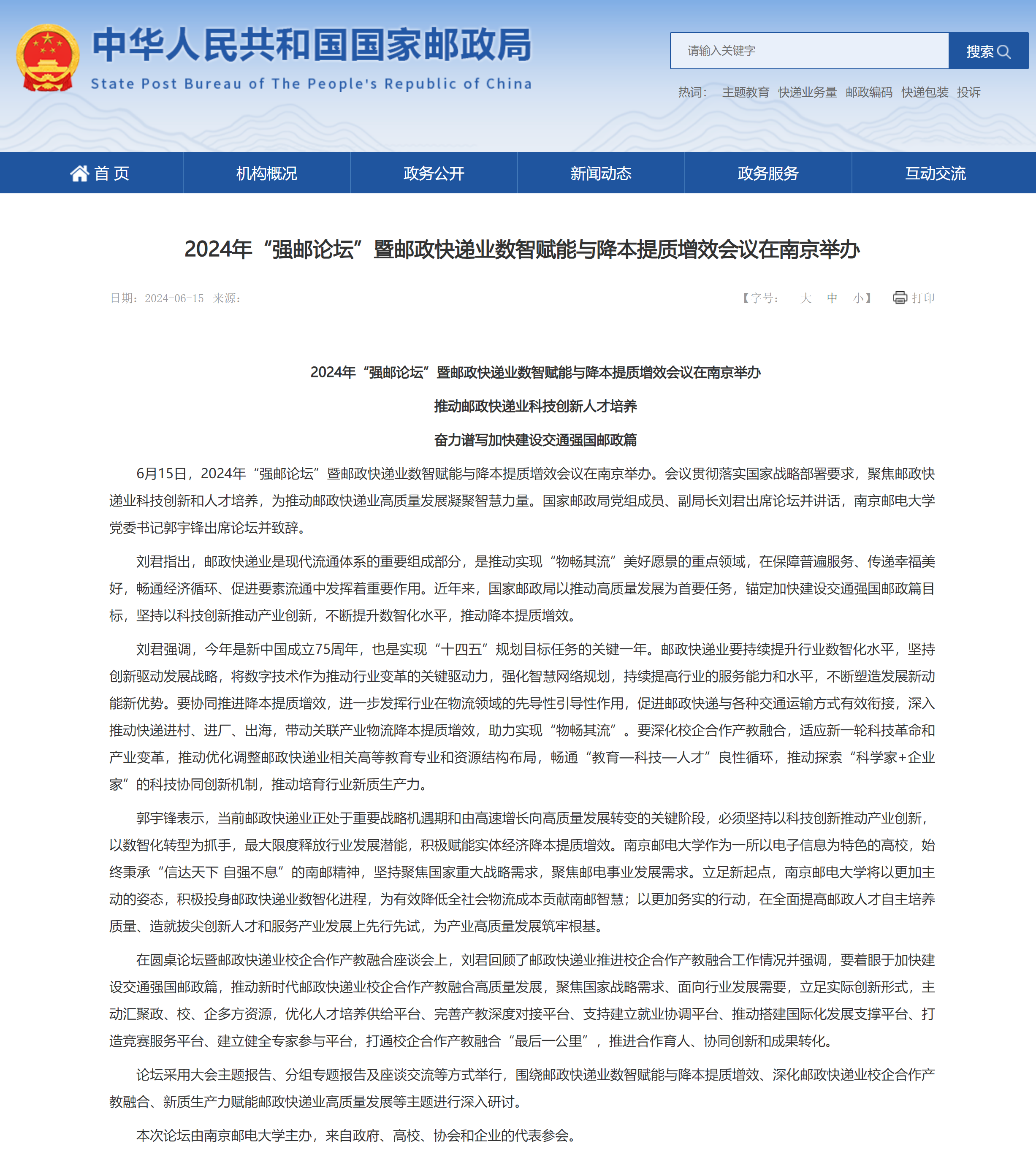 【國家郵政局官網】2024年“強郵論壇”暨郵政快遞業數智賦能與降本提質增效會議在南京舉辦