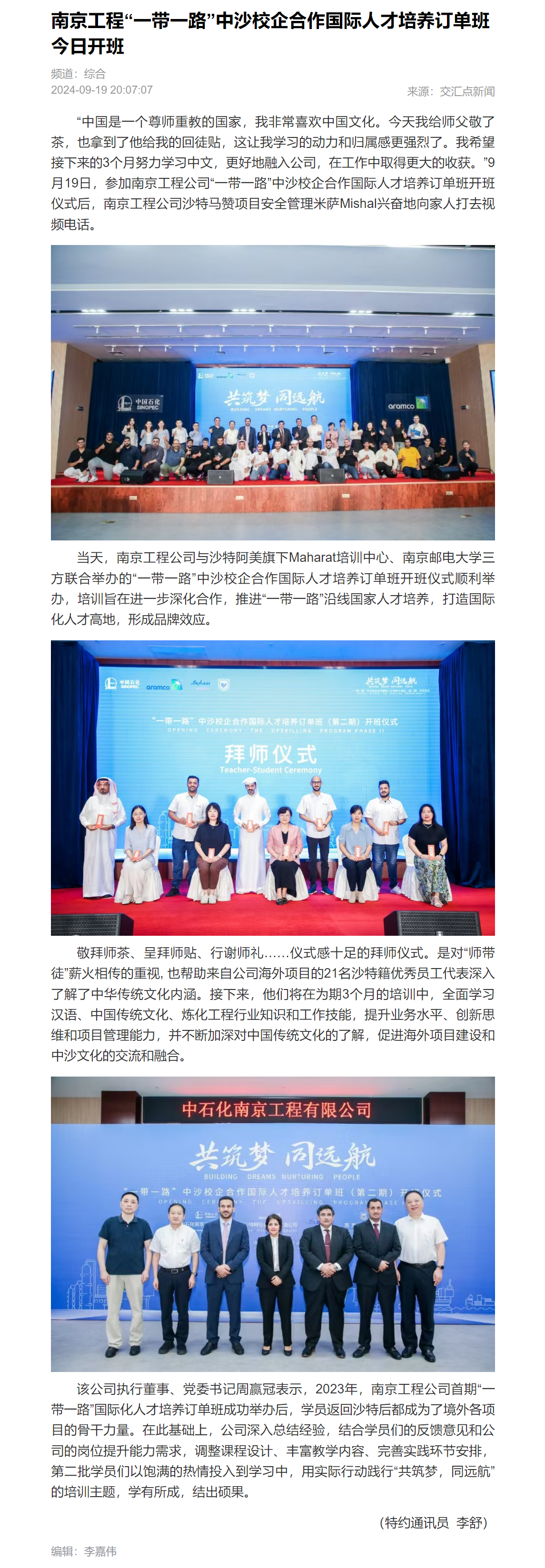 【新華日報客戶端】南京工程“一帶一路”中沙校企合作國際人才培養訂單班今日開班