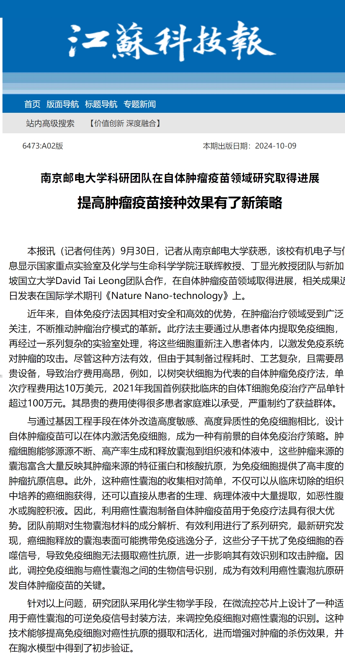 | 【江蘇科技報(bào)】南京郵電大學(xué)科研團(tuán)隊(duì)在自體腫瘤疫苗領(lǐng)域研究取得進(jìn)展 提高腫瘤疫苗接種效果有了新策略 |