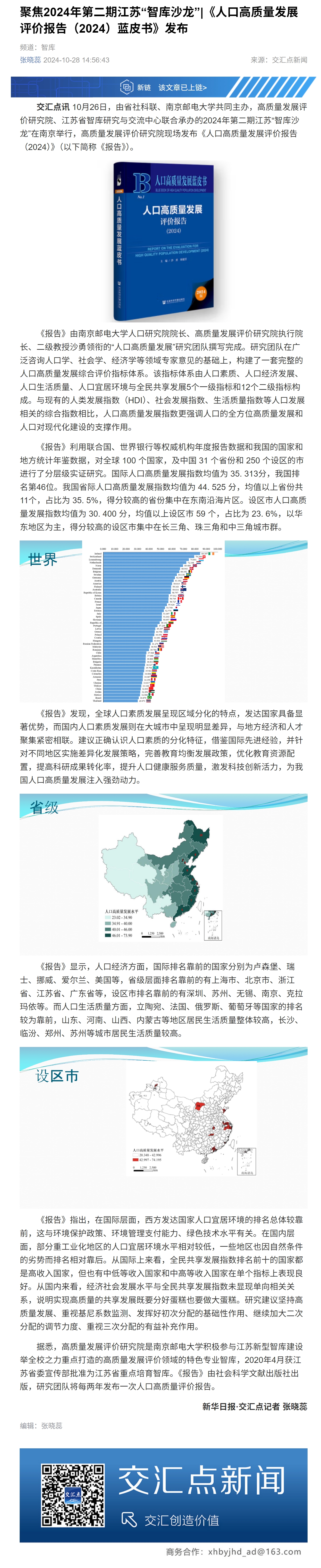 | 【新華日報客戶端】聚焦2024年第二期江蘇“智庫沙龍”|《人口高質量發展評價報告(2024)藍皮書》發布 |