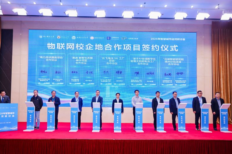 南京郵電大學校長葉美蘭教授致辭 開幕式上舉行了“物聯網校企地合作項目簽約儀式”。揚州經濟技術開發區作為揚州科技創新的核心引擎,現場簽約了9個重點項目,涵蓋人工智能、低空經濟、5G工廠、數字化管理等前沿領域。