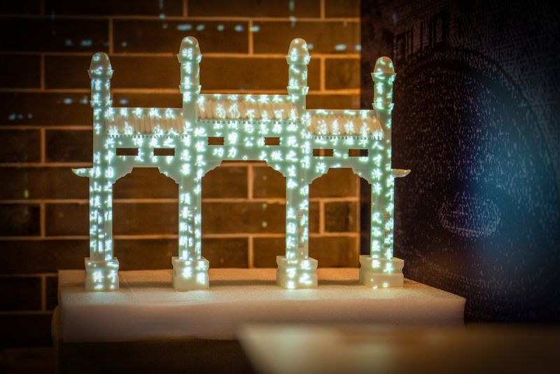 展廳中,《毓秀鐘山》通過動態(tài)數字屏風,徐徐展開鐘山十八景,展現當代藝術對傳統(tǒng)景觀的重新詮釋;《碑影詩廊》借AI詩詞風韻,將明孝陵的四季風華凝練于墨香詩韻之間;《對話洪武》通過AI塑造朱元璋數字人形象,打造跨越時空的古今對話場景;《紫臺觀天》透過全息光影,讓紫金山天文臺的觀測臺與銀河星輝在虛實交融中流轉;《紫臺造境》以紫金山天文臺為時空原點,通過AI算法編織科技與詩性對話的視覺詩篇;《幻夢陵境》借由彩繪的絢爛筆觸,為博愛牌坊注入新的藝術特質。