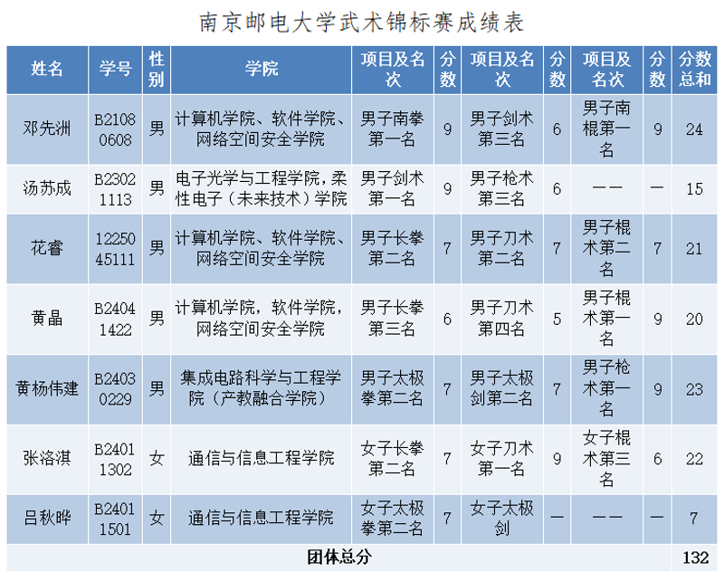 湯蘇成、鄧先洲、黃楊偉建、黃晶、張洛淇同學分別獲男子劍術、男子南拳南棍、男子槍術、男子棍術、女子刀術項目金牌。花睿、黃楊偉建、張洛淇、呂秋曄同學分別獲男子長拳、棍術、刀術、男子太極拳、太極劍、女子長拳、女子太極拳項目銀牌。鄧先洲、湯蘇成、黃晶、張洛淇同學分別獲男子劍術、男子槍術、男子長拳、女子棍術項目銅牌,黃晶同學還獲得男子刀術第四名。