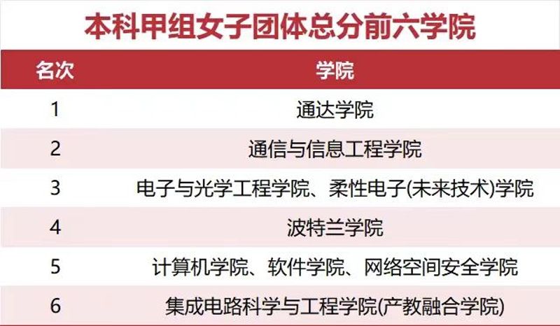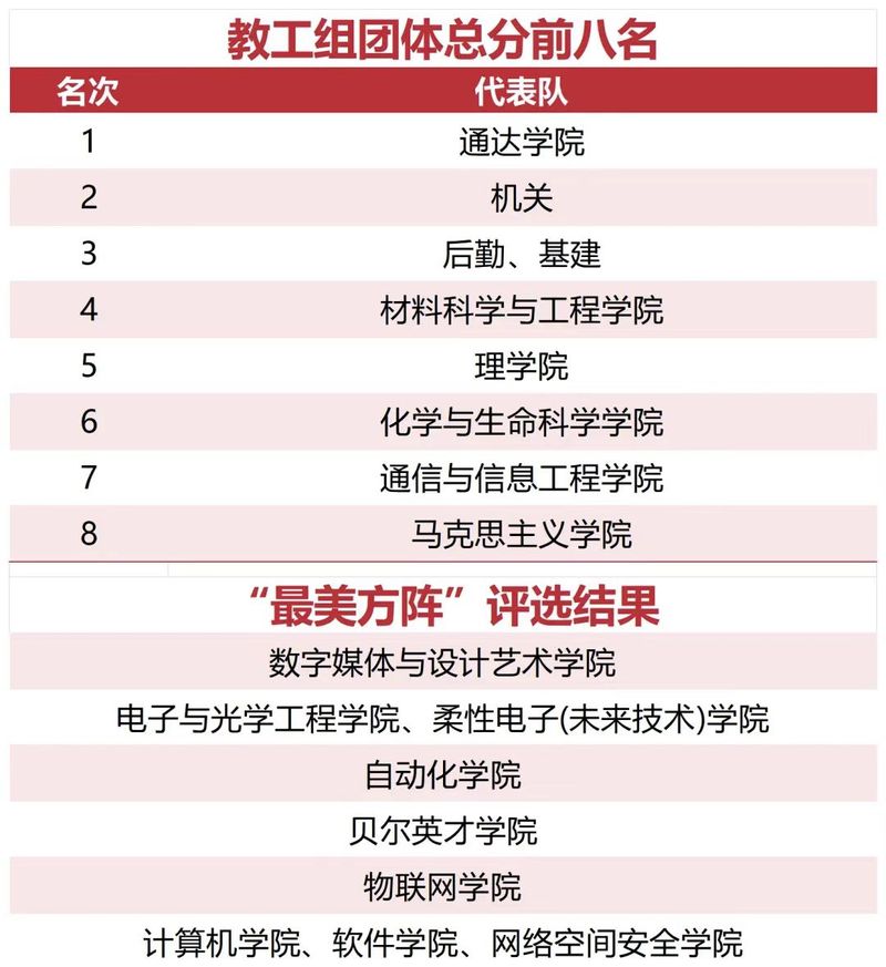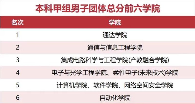 10月25日下午,運(yùn)動(dòng)會(huì)落幕。材料科學(xué)與工程學(xué)院榮獲研究生男女團(tuán)體總分第一名,海外教育學(xué)院榮獲本科女子乙組團(tuán)體、本科男子乙組團(tuán)體、本科乙組男女團(tuán)體總分第一名,通達(dá)學(xué)院榮獲本科女子甲組團(tuán)體、本科男子甲組團(tuán)體總分第一名。數(shù)字媒體與設(shè)計(jì)藝術(shù)學(xué)院,電子與光學(xué)工程學(xué)院、柔性電子(未來(lái)技術(shù))學(xué)院,自動(dòng)化學(xué)院,貝爾英才學(xué)院,物聯(lián)網(wǎng)學(xué)院,計(jì)算機(jī)學(xué)院、軟件學(xué)院、網(wǎng)絡(luò)空間安全學(xué)院獲評(píng)“最美方陣”。