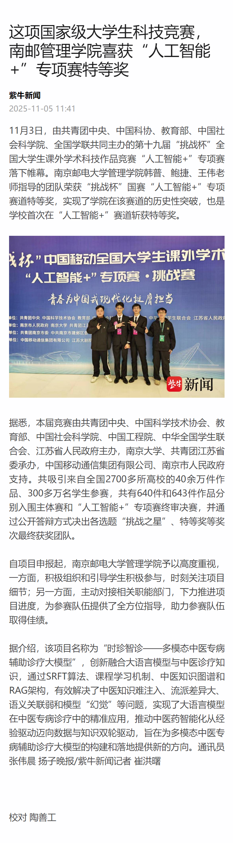 【揚子晚報客戶端】這項國家級大學生科技競賽,南郵管理學院喜獲“人工智能+”專項賽特等獎