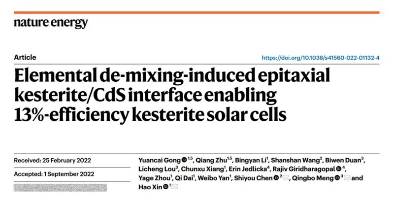 The team also systematically studied the construction process of the heterojunction interface of kesterite cells and revealed for the first time the mechanism of defect formation at the heterojunction interface and of epitaxial heterojunction interface by low-temperature annealing. The results were published in the international academic journal Nature Energy on October 6, 2022 with the title “Elemental de-mixing-induced epitaxial kesterite/CdS interface enabling 13%-efficiency kesterite solar cells”. Prof. Xin from the School of Chemistry and Life Sciences, NJUPT, Prof. Chen Shiyou from Fudan University and Prof. Meng Qingbo from the Institute of Physics, Chinese Academy of Sciences were the co-corresponding authors, and PhD student Gong Yuancai and MS student Zhu Qiang from NJUPT were the co-first authors.
