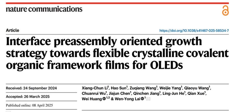 Focusing on the structure-property relationship of conjugated organic framework (COF) materials, the team achieved synergistic control of optoelectronic properties and mechanical performance through molecular design. The related findings, titled Interface Preassembly Oriented Growth Strategy Towards Flexible Crystalline Covalent Organic Framework Films for OLEDs, were published in Nature Communications (2025, 16, 3321).